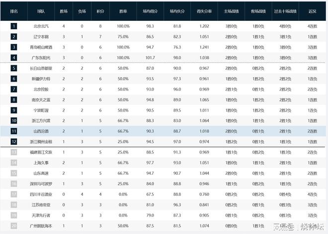北京时间12月20日晚,2025/26赛季CBA常规赛,第4轮比赛先战6场。本轮吉林、辽宁、山东、北京和浙江皆在主场获胜,唯有四川队主场输球,而南京队在客场大胜。